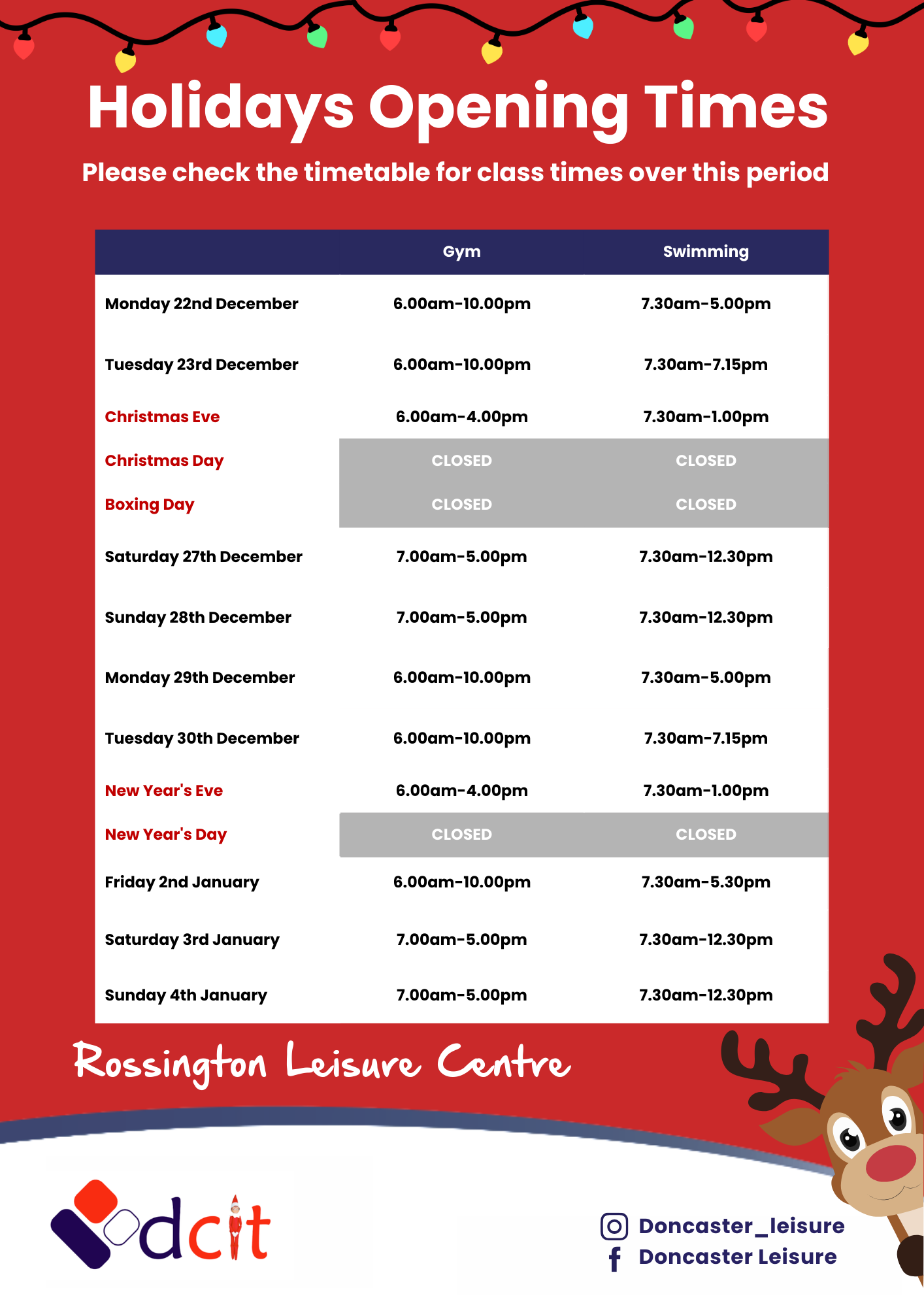 Please note this is the centre's opening hours. Swimming opening hours are subject to session times.